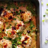 FORM the meatball mixture into small meatballs (about 1½ to 2 inches in diameter) and place them evenly in the baking dish filled with sauce. Spoon over the meatballs with the sauce. Add your greens (optional).