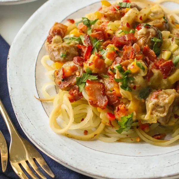 Smoky bacon, savory Italian chicken sausage, tender veggies, and a creamy dairy-free sauce all come together in one skillet for a dinner that feels cozy without being heavy.