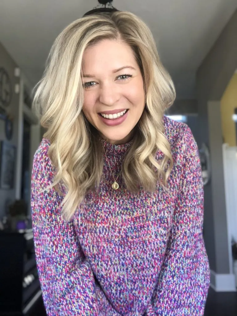 Althea Brown in a blue shirt, with her hand on her chin smiling at the camera.